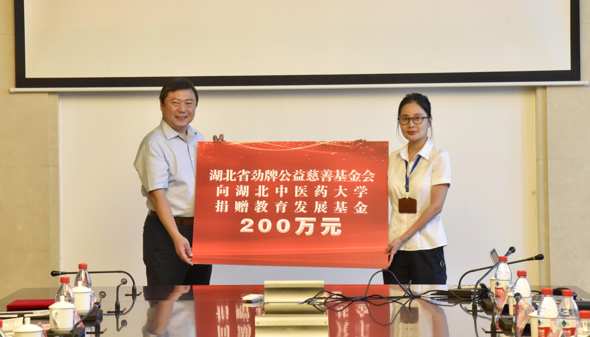 勁牌公益慈善基金會副理事長吳曉敏授予湖北中醫(yī)藥大學(xué)辦公室主任汪海洋捐贈牌。